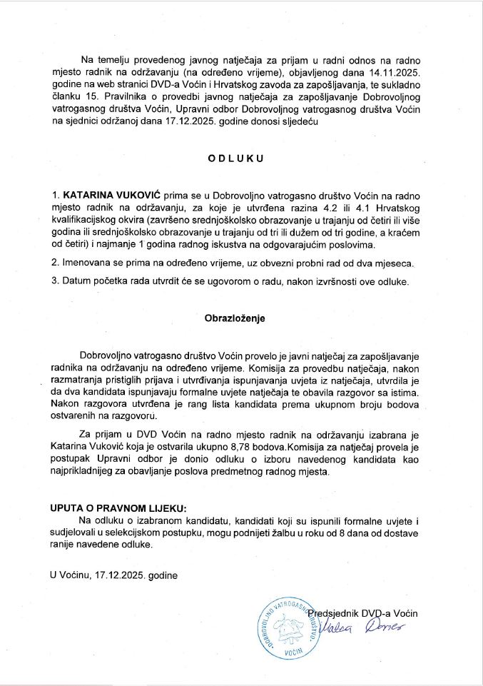 Odluka o obustavi postupka javnog natječaja za prijem na određeno vrijeme u Dobrovoljno vatrogasno društvo Voćin